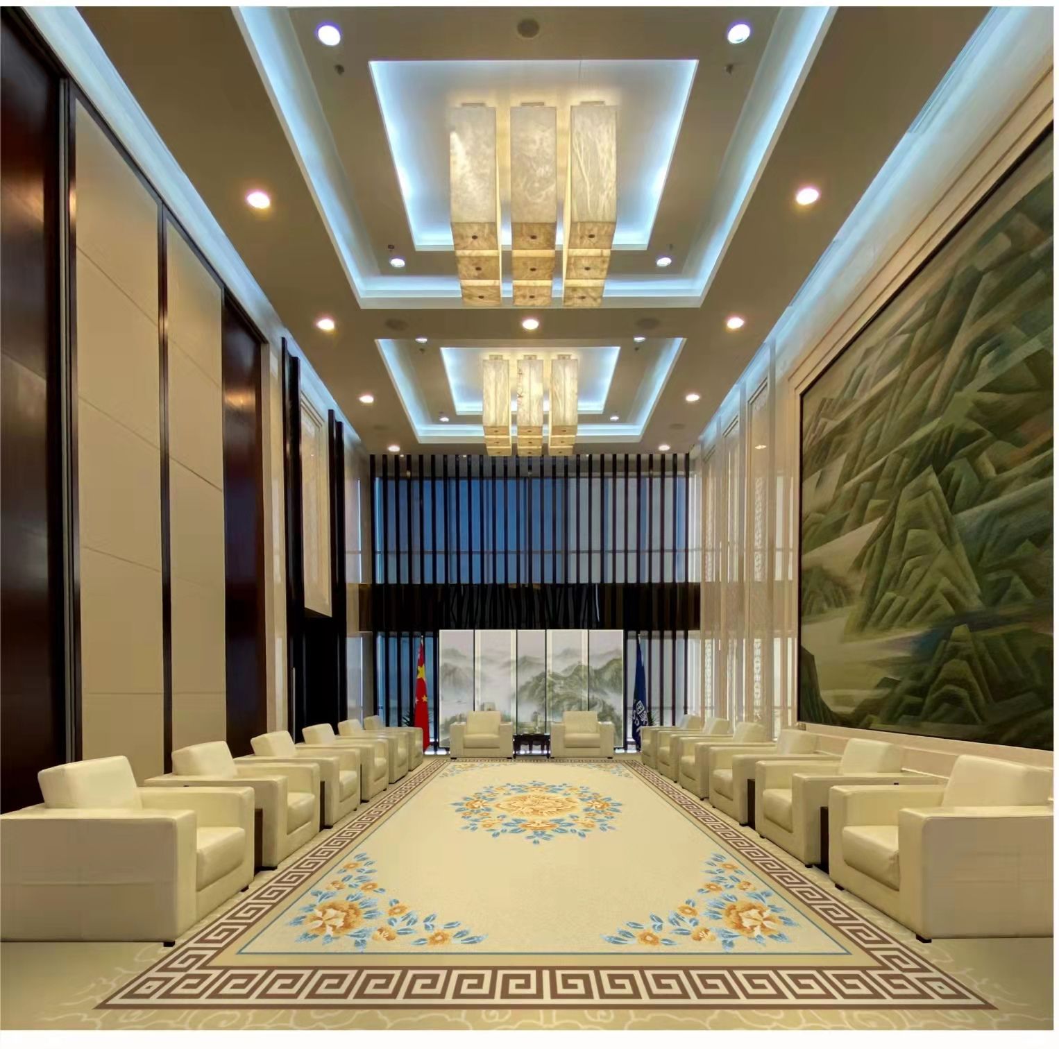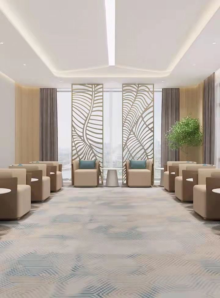 貴賓接待室地毯是接待領導和貴賓的地毯,裝飾一般以新中式和簡歐風格居多,貴賓室格調是大氣、高貴、典雅、嚴肅而不失活躍,具有一定的地域文化品味。