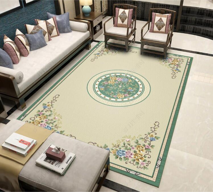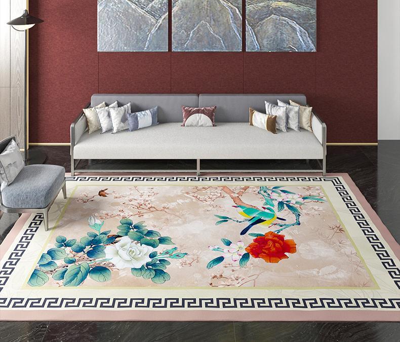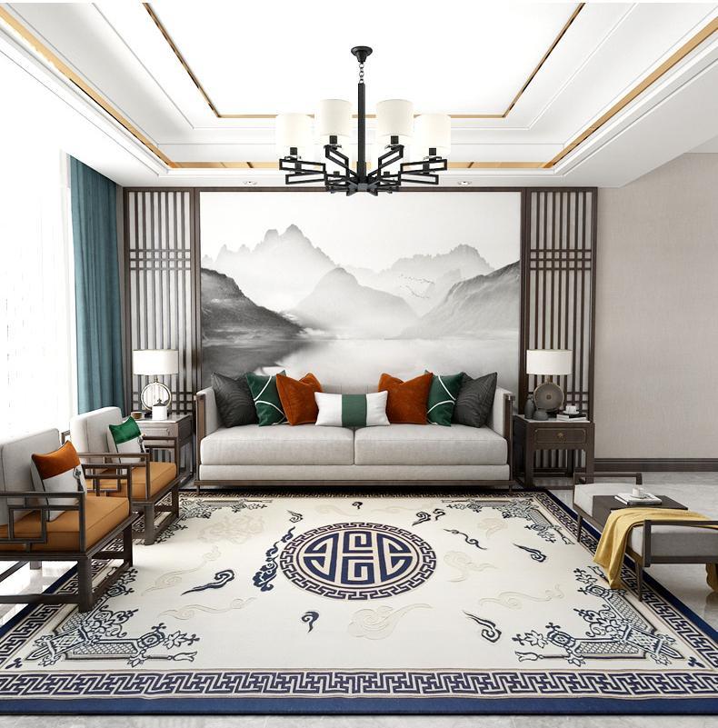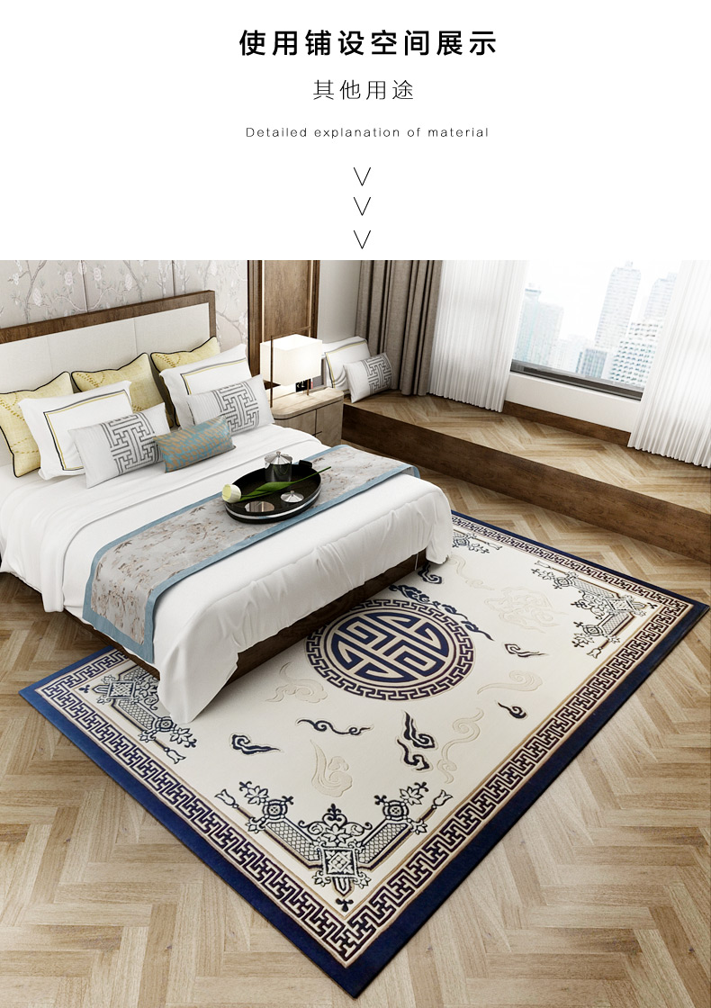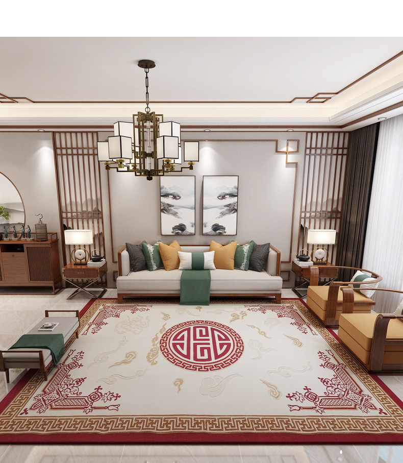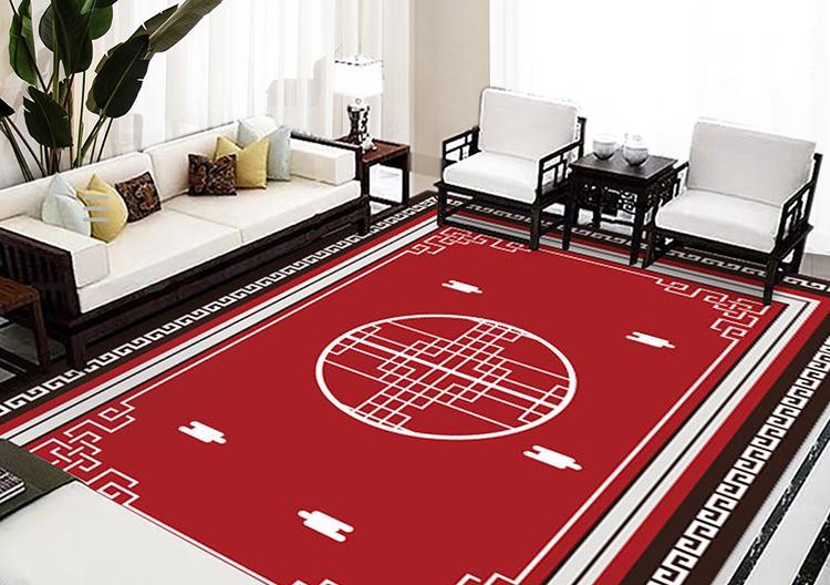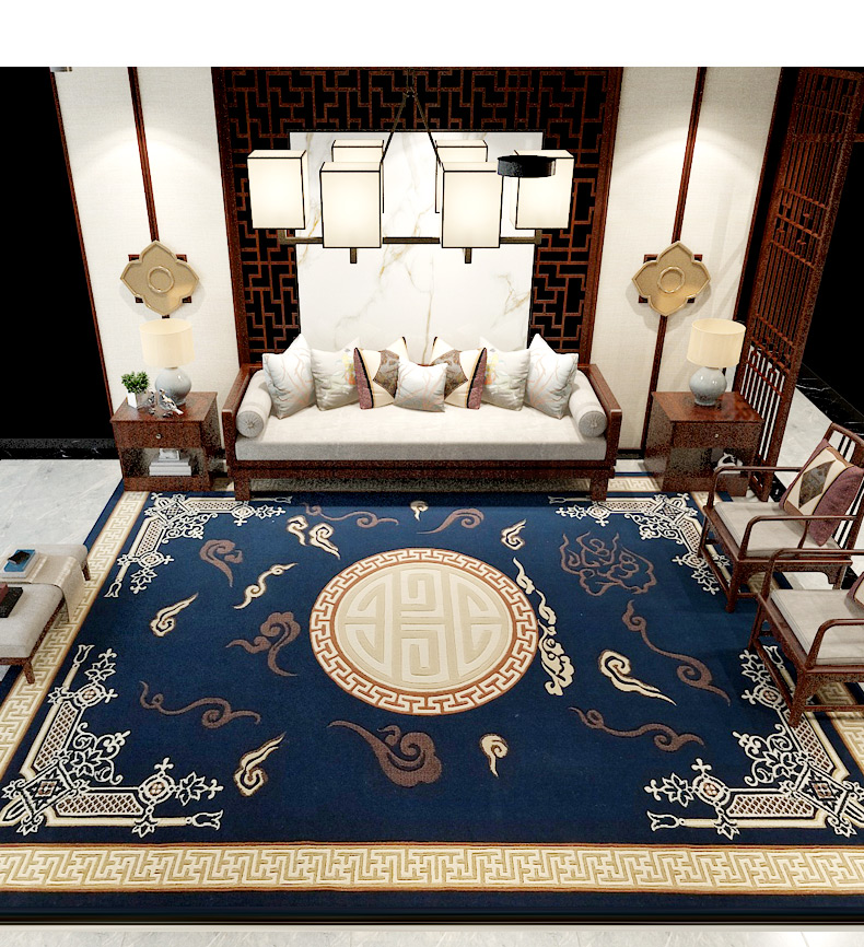 中國地毯花紋主要常用樣式有團花紋樣、卷草紋樣、云紋樣?;匦图y樣、荷花、梅蘭竹菊紋樣等。